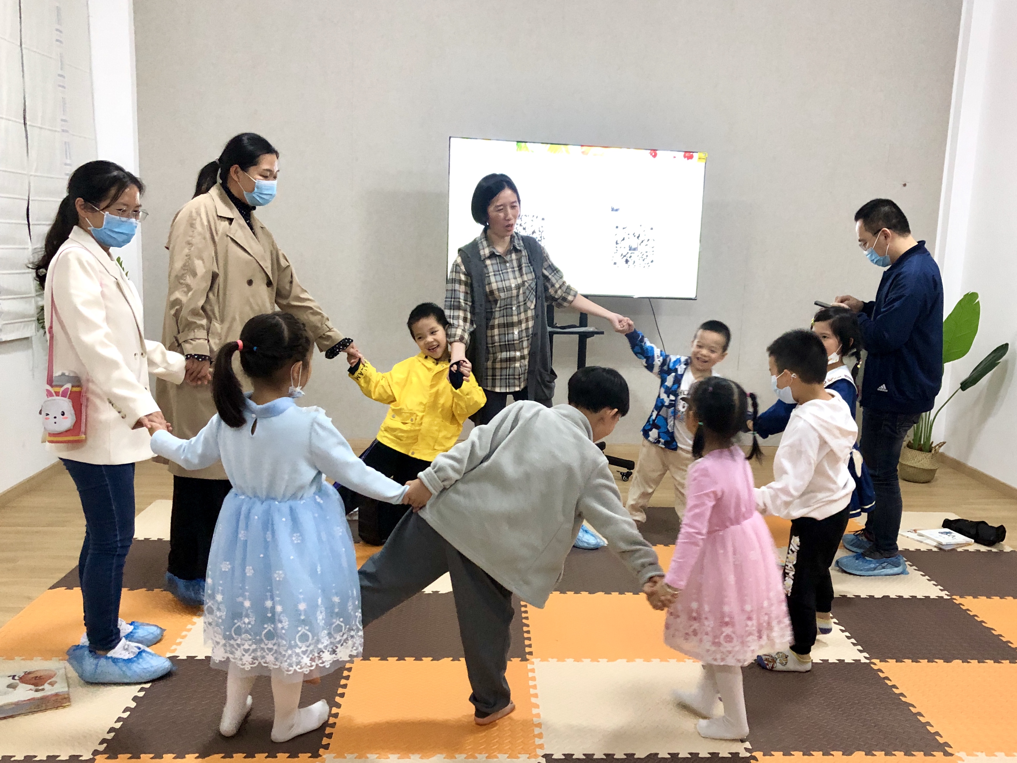 接着,缪愉老师分享了三种共读方式,家长孩子们带着问题,自由阅读讨论,启发孩子们的思考。随后,带领家长孩子们一起玩共读游戏——“有趣的拟声词”。孩子们在游戏中,不仅学会了很多小动物的叫声,还锻炼了手眼协调能力,真是一举两得呀!
