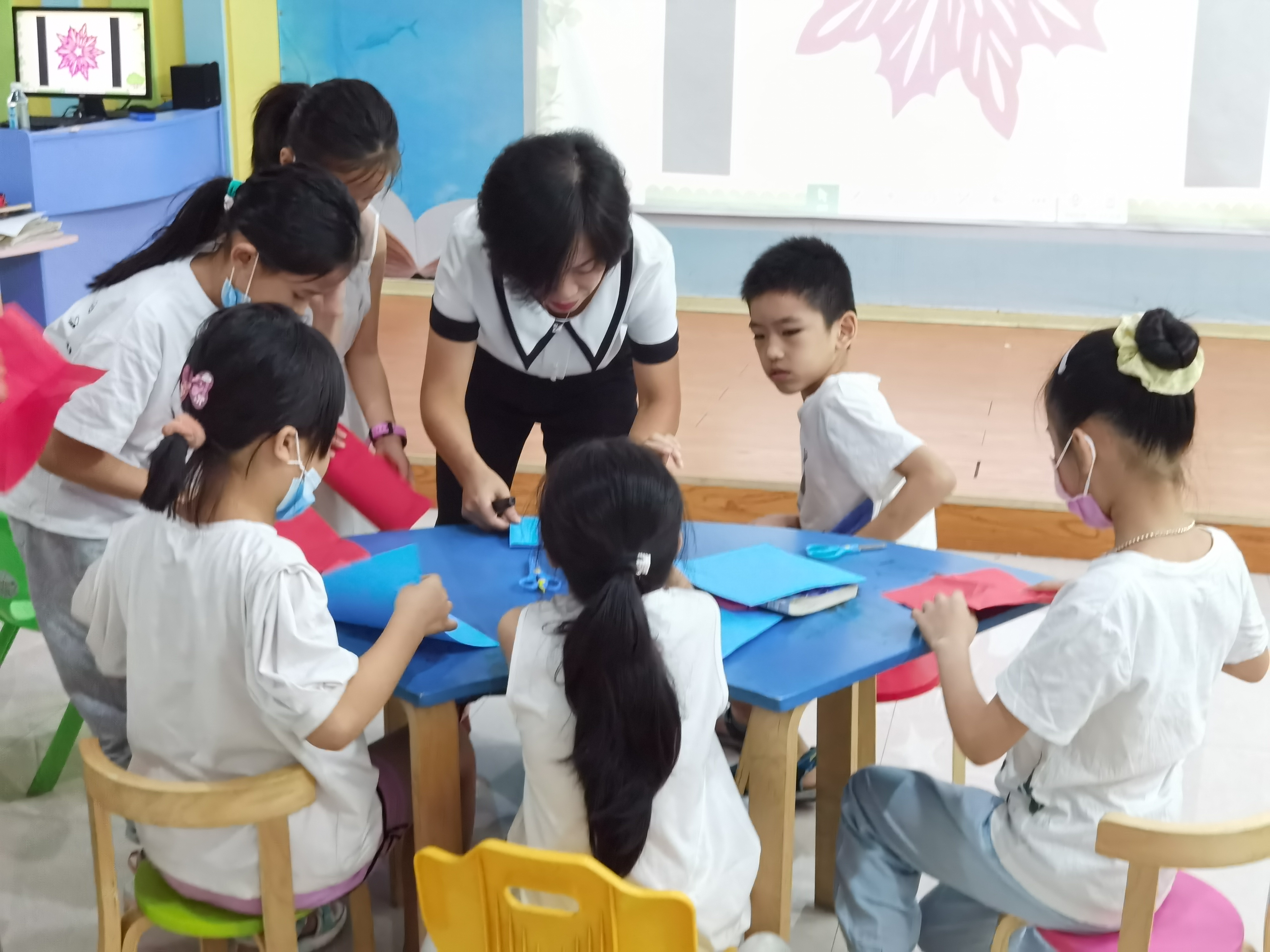 活动课上,林老师组织同学们听剪桐封弟故事,引出剪纸这项民间手工艺术,带领孩子们观察作者、前言、后序、目录的介绍猜测书本内容。林老师展示一些优美的剪纸作品,一张张利用剪刀加工出的活灵活现的艺术品涌动着生命的气息。随后,拿出了三张折叠好的纸张,邀请三名同学上台剪纸,让同学们从实践中感受剪纸艺术的魅力。