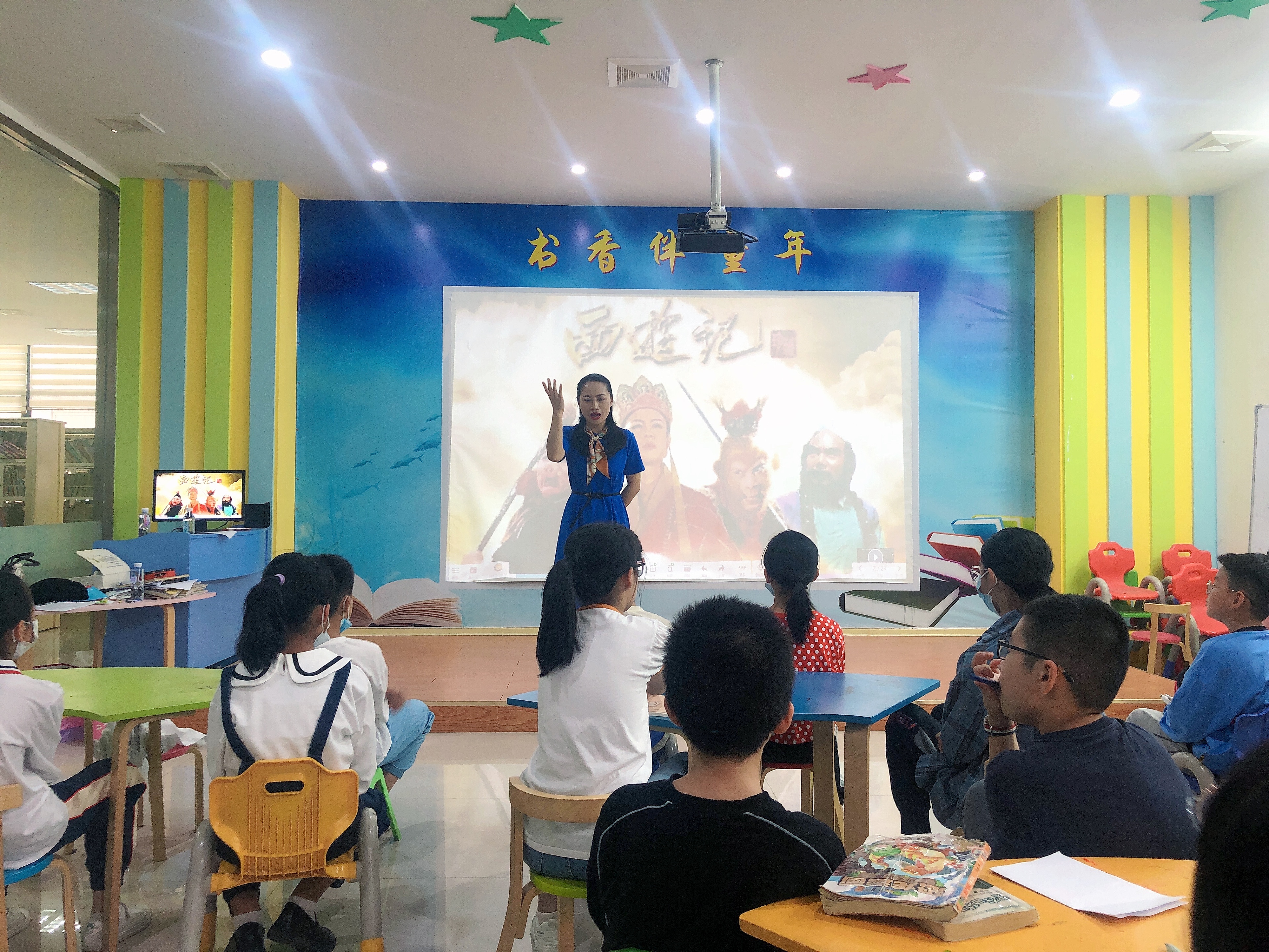 活动课上,薛老师播放《西游记》主题曲,同学们用心听曲,分享脑海中出现的《西游记》人物。随后,薛老师向同学们介绍作者及书本内容,开启“西游大神知多少”热身练习,通过各个问题,引出人物介绍,带着同学们了解小说内容。
