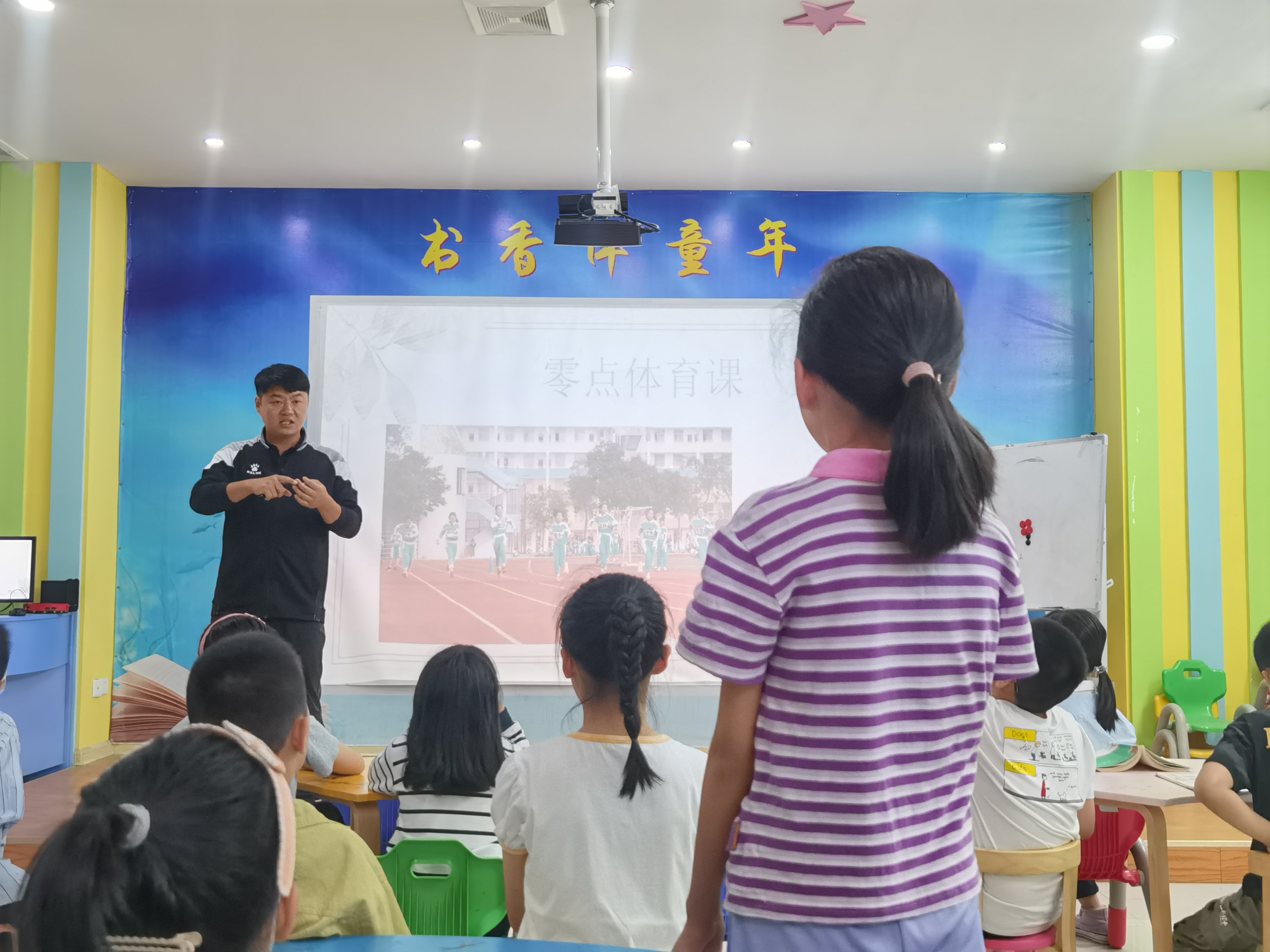 活动课上,张老师对作者及书本内容板块进行了介绍,让同学们回顾平时是何时段上体育课,体育课上都有哪些运动项目。随后,张老师带领同学们进行部分片段阅读,了解“零点体育课”的成效判断标准和效果,并总结归纳“零点体育课”与传统体育课的不同之处。