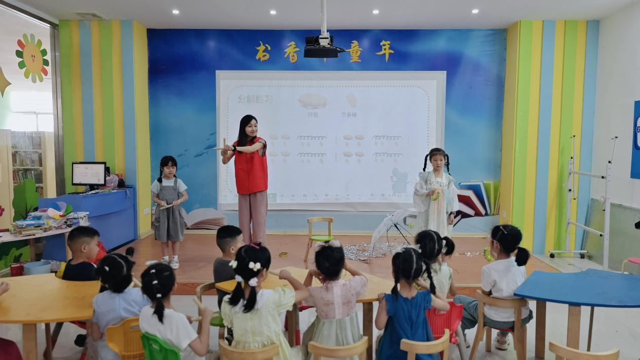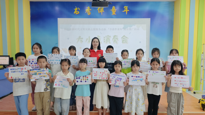 6月7日,福安实小南湖校区杨乾英老师带领孩子们开展《大小点演奏会》趣味阅读推广活动。以"大小点"奇幻冒险故事为引,通过生日歌铃鼓互动,让孩子们在玩转节奏、创编音乐密码的过程中,轻松感知音乐元素。活动将抽象乐理转化为可参与的互动游戏,用●○等视觉符号辅助理解,降低学习门槛,让孩子们在协作创作中充分体验音乐带来的乐趣与惊喜。