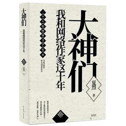 书名: 大神们-我和网络作家这十年 作者: 夏烈 出版社: 花城出版社 出版日期:2018-05-01 内容简介: 本书以通俗畅达的散文随笔语言,回忆了作者这十年中与中国网络文学大神,尤其是以南派三叔、沧月、流潋紫等为代表的网络作家的交流,梳理了网络文学史料,品评网络小说,讲述动人的细节、幕后,是当代网络文学亲历者、组织者、评论家对于神秘且热门的网络文学的零距离书写,对网络文学研究者、爱好者、粉丝等都有一定程度的吸引力和文献参考价值,填补了当下网络文学研究的文体和内容空白。