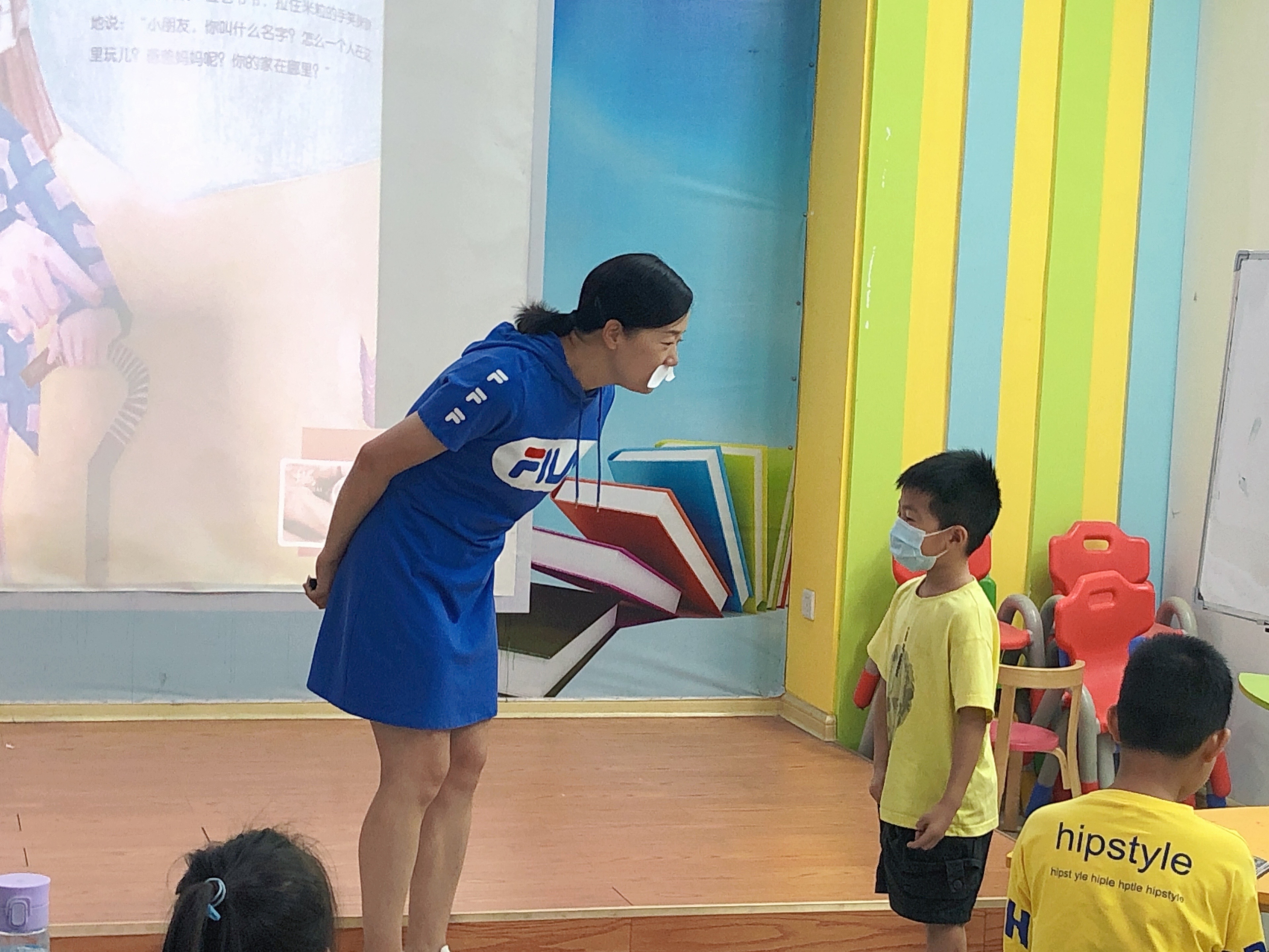 孩子们陶醉在王老师优美的嗓音中,仔细品味绘本中妈妈和孩子的感人故事。讲完故事后,王老师让孩子们尝试用英语表达自己最喜欢家庭成员中的哪一位并说明原因,在王老师的鼓励下,孩子们都勇敢开口,现场氛围十分热烈。
