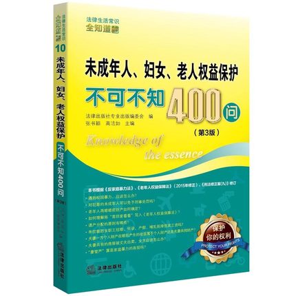 书名: 未成年人、妇女、老人权益保护不可不知400问 作者: 法律出版社专业出版编委会 出版社: 法律出版社 出版日期:2016-06-01 内容简介:本为法律生活全知道系列丛之一,结合生活中的典型、重点、新型问题组织编写,提出问题的同时给出简洁清晰的回答,很多问题直接来源于真实案例,全内容注重实用性,贴近日常生活,融知识性、实用性与工具性为一体,涵盖日常生活领域妇女、未成年人、老年人等弱势群体维权遇到的所有问题,并有清晰直接的回答,对国家新的政策也有设问,对弱势群体维权有很大帮助。